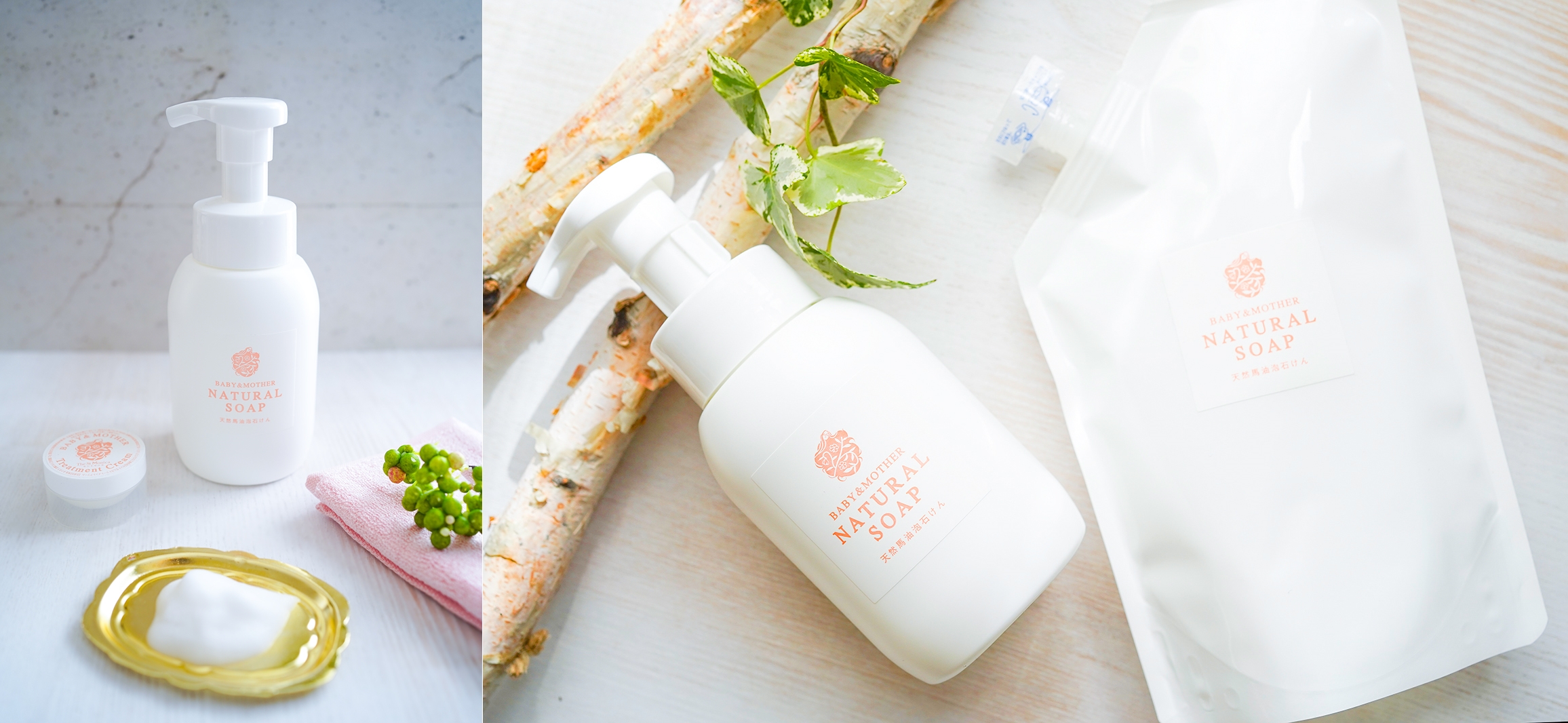 大切な家族のお肌をいたわる、天然馬油と白樺樹液配合のクリームと泡せっけんのセットです。