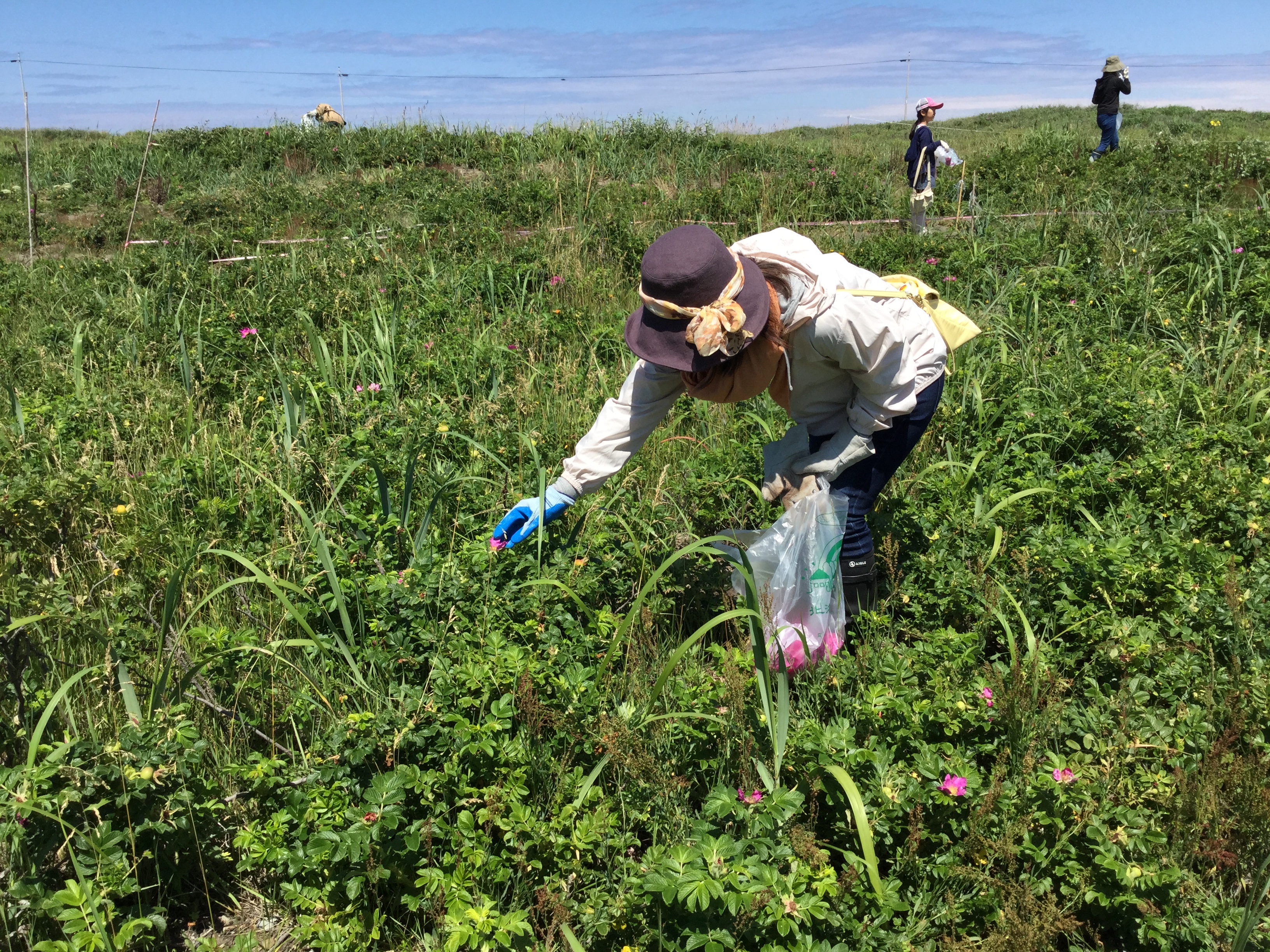 北海道石狩市の石狩浜に咲く自然栽培のはまなすの花を私たちが手摘みしています。