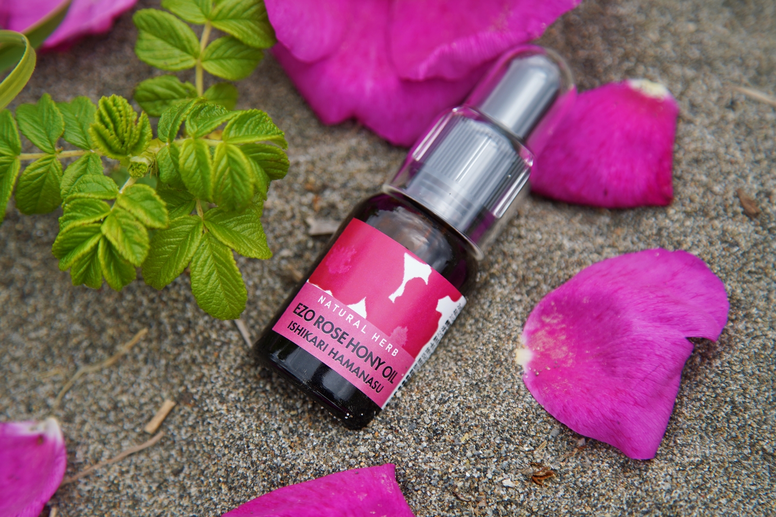 北海道石狩市の石狩浜に咲く自然栽培のハマナスの花を私たちが手摘みし、北海道石狩の自然養蜂家 La table vert(ラ・ターブルベール)尾形さんのHAMANASU HONEY(ハマナスハニー)も使った、マッサージもできる保湿オイルです。